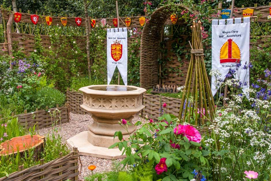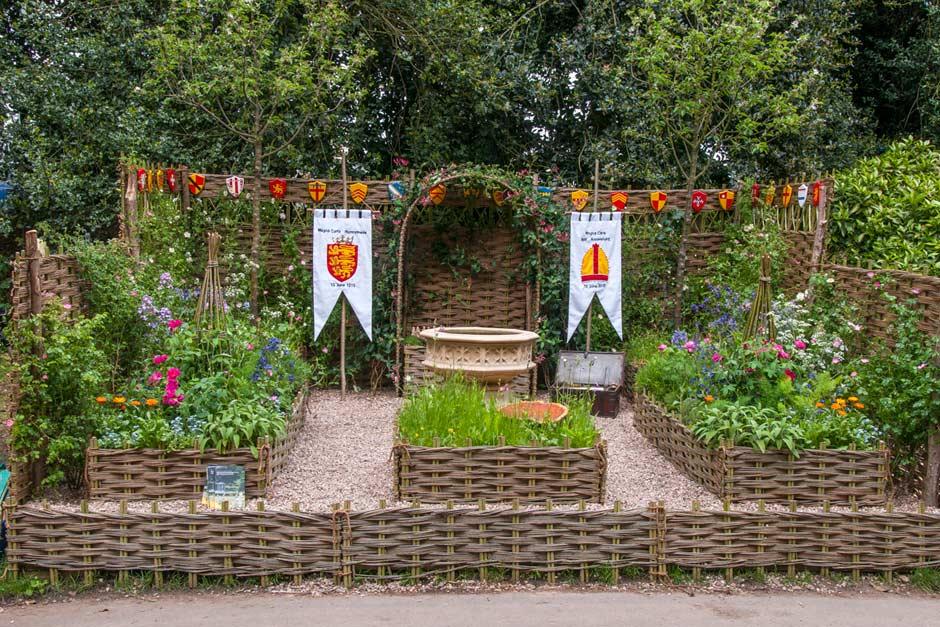 This small artisan garden, sponsored by Surrey County Council and Runnymede Hotel, celebrates a grand event: in 1215 the Magna Carta was sealed under oath by King John at Runnymede, the first legal document imposed upon an English sovereign by a group of his subjects. 2015 marks the 800th anniversary of the Magna Carta.