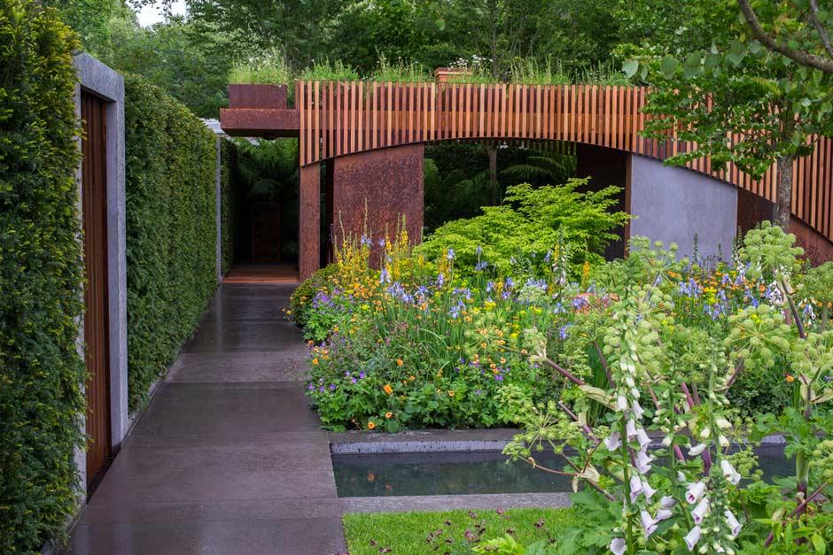 The three main materials are Portland cement concrete, corten steel and cedar, which reflect the imagined urban landscape. The planting is mainly ornamental and wildlife-friendly.