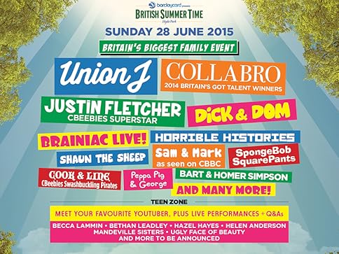 Stars of the show include X Factor semi-finalists Union J, 2014 Britain’s Got Talent winners Collabro, CBeebies superstar Justin Fletcher, kids’ favourites Dick and Dom, BAFTA Award-winning children’s presenters Sam and Mark, SpongeBob SquarePants, Bart and Homer Simpson, Horrible Histories, Brainiac Live!, Shaun the Sheep and more. And a special Teen Zone will also give youngsters the chance to meet their favourite YouTube stars – Hyde Park has never been so packed with family fun.