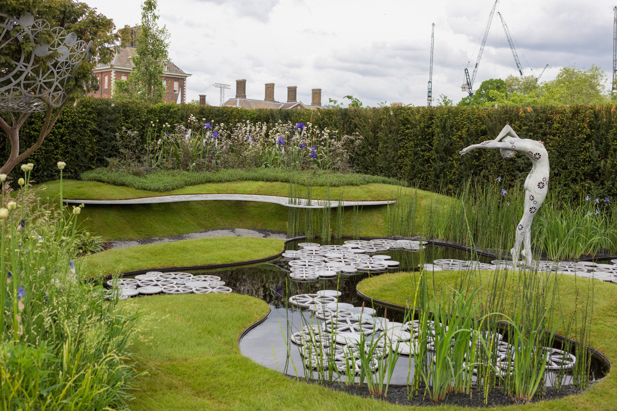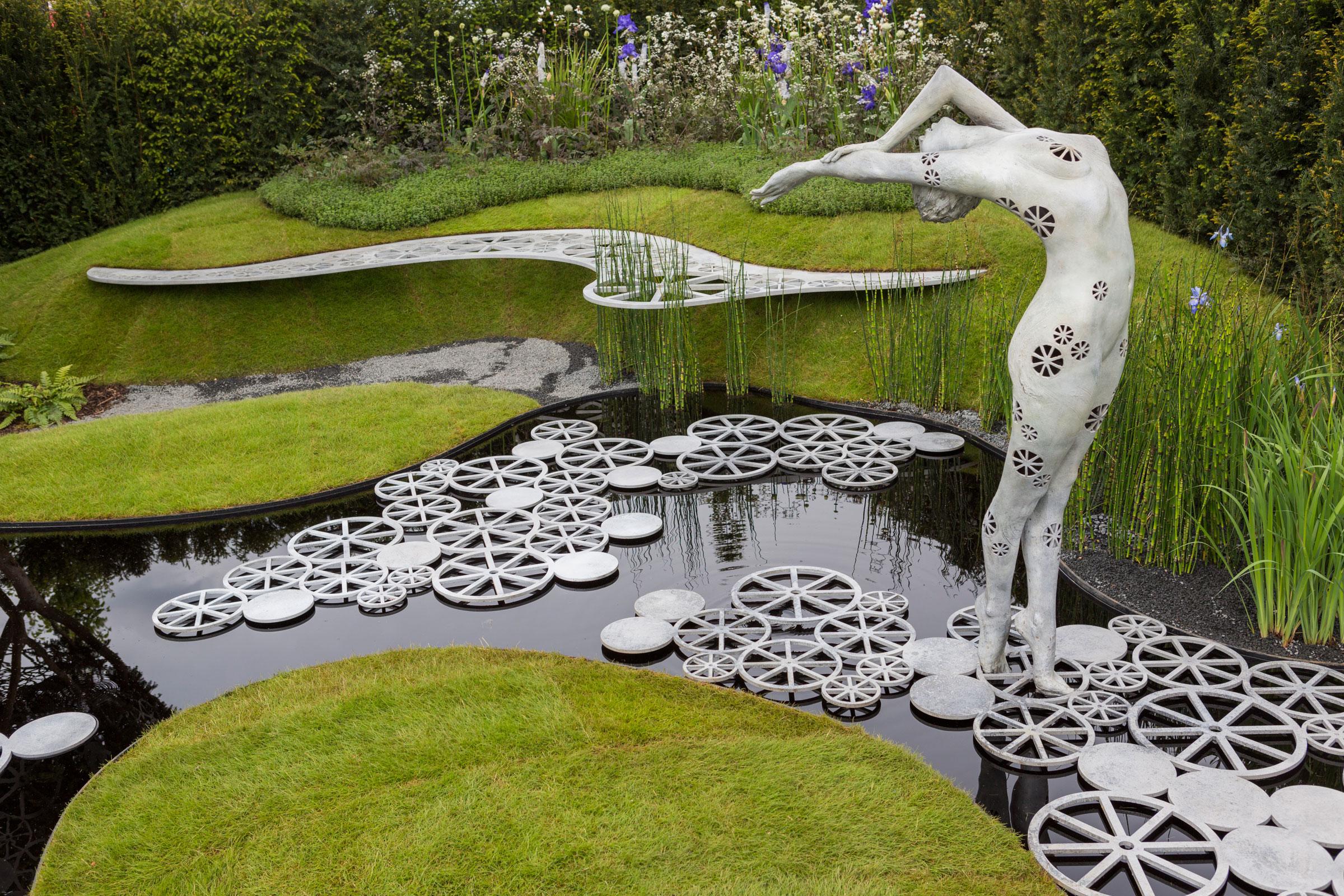 Central to the garden is the symbolic theme of lace, which weaves its way through to bring a unifying harmony to the two sides of the garden. The two key focal points in the garden are the striking metal lace and an arching bronze figurative water feature 'River of Time', both made by Ukrainian sculptor Victoria Chichinadze.